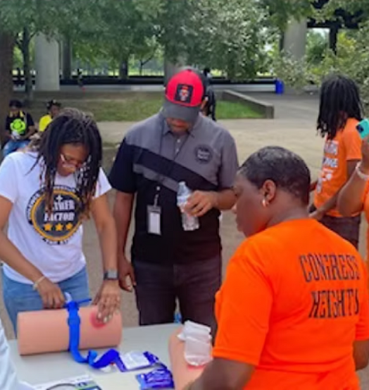 Stop The Bleed has been a basic component of Peace For DC’s work since Day One. Just as you would use CPR if someone had a heart attack or the Heimlich maneuver if someone was choking, Stop The Bleed is a first aid method that includes using gauze and tourniquets if someone is at risk of bleeding out from a gunshot or stab wound. DC’s Community Violence Intervention professionals learn these skills at the DC Peace Academy, and then they are able to help should they be the first on the scene before emergency medical services arrive. We are so thankful for our partnerships with medical professionals at Howard University Hospital and MedStar Washington Hospital Center, who lead these classes and share their knowledge.